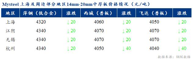 上周五上海中板現貨價格窄幅下行20-40元/噸。截止目前,上海普中板主流4080元/噸,低合金主流4320元/噸,C板主流4450元/噸,D板主流4490元/噸。