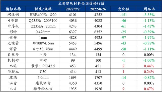 2、基建需求維穩,截至9月1日,百年建筑調研國內202家大型礦山企業砂石總出貨量為1518.28萬噸,周環比上升0.11%;截至8月29日,國內250家水泥生產企業出庫量822.25萬噸,環比上升4.75%,繼上周反彈后繼續回補;當期水泥直供量為247萬噸,環比回升8.33%。高溫逐漸消退,前期被動縮短的工期恢復正常,重點民生項目為按時完成工期稍有趕工,另外局部區域出現脈沖式增長,基建需求再沖新高。總體來看,華東需求繼續保持增長態勢,華中投機需求下降后,重回跌勢;華南、西南市場需求回補;三北市場華北、東北表現尚佳。進入9月以后氣溫下降利于施工,加之多項利好政策的刺激,整體市場需求持續提升。但西南市場脈沖式增長后或大幅回落,2022年9月1日,成都市政府發布2022年第5號疫情防控通告。此輪疫情防控對建材市場影響較大,市場基本停滯3天,具體恢復時間待通知。