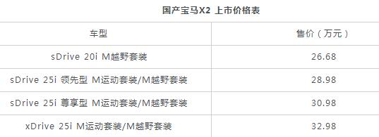 10月11日,華晨寶馬宣布國產寶馬X2正式上市,新車共7款車型,售價區間26.68-32.98萬元,其中除了sDrive 20i M越野套裝車型外,其余車型均可選擇M運動套裝/M越野套裝,進一步豐富了消費者選擇。新車基于UKL平臺打造,提供熟悉的1.5T三缸渦輪增壓發動機和2.0T四缸渦輪增壓發動機。