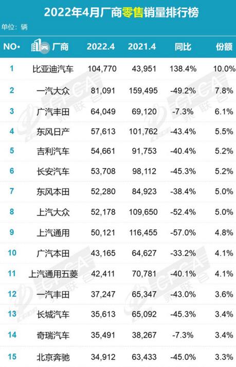 中新財經注意到,4月,自主品牌多年來首次超越合資品牌,登頂國內月度汽車銷量排行榜。比亞迪月銷量超10.47萬輛,同比增長138.4%,排名第一。第二名和第三名分別是一汽-大眾和廣汽豐田。