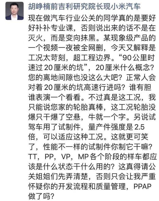 對此回應(yīng),原吉利研究院院長胡崢楠在其朋友圈表示了質(zhì)疑,其表示,“90公里時速過20厘米的坑”不太符合實際情況。一般車輛的離地間隙都沒20厘米。且正常人不會對著20厘米的坑高速行進(jìn)。“而如果真是這種工況,那我只能說您家的輪胎真棒,這工況輪胎沒爆只干爆了空懸,牛就一個字!