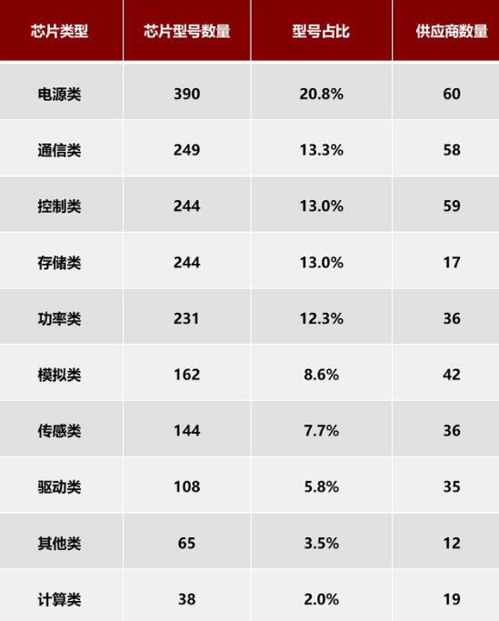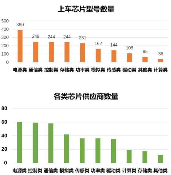 電源類、通信類和控制類芯片型號數量最多,供應商也最廣泛,這幾類芯片在車上需求量大款型多,大部分性能需求不高,為國產芯片上車提供了廣闊的市場空間;