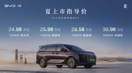 1月8日晚間消息,中大型智能旗艦MPV比亞迪夏今日正式上市,共有4款配置,分為CLTC工況續航100km/180km,2種純電續航版本。并提供4種外觀顏色及2種內飾配色可選,售價為24.98-30.98萬元。