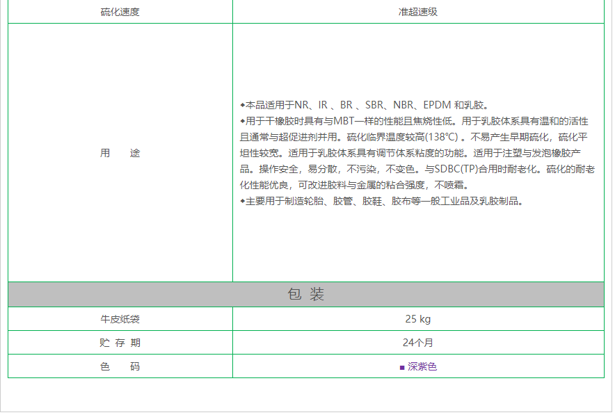 用 途: 高速硫化促進劑 ,不具有橡膠染色性。適用于nr、ir、br 、sbr、nbr、epdm和乳膠。用于干橡膠時,具有與mbt一樣的性能且抗焦燒性優異。用于乳膠體系具有溫和的活性且通常與超促進劑 并用。硫化臨界溫度較高(138℃)。不易產生早期硫化,硫化平坦性較寬。適用于乳膠體系具有調節體系粘度的功能。適用于注塑與發泡橡膠產品。操作安 全,易分散,不污染,不變色。與tp合用時耐老化。主要用于制造輪胎、膠管、膠鞋、膠布等一般工業品。