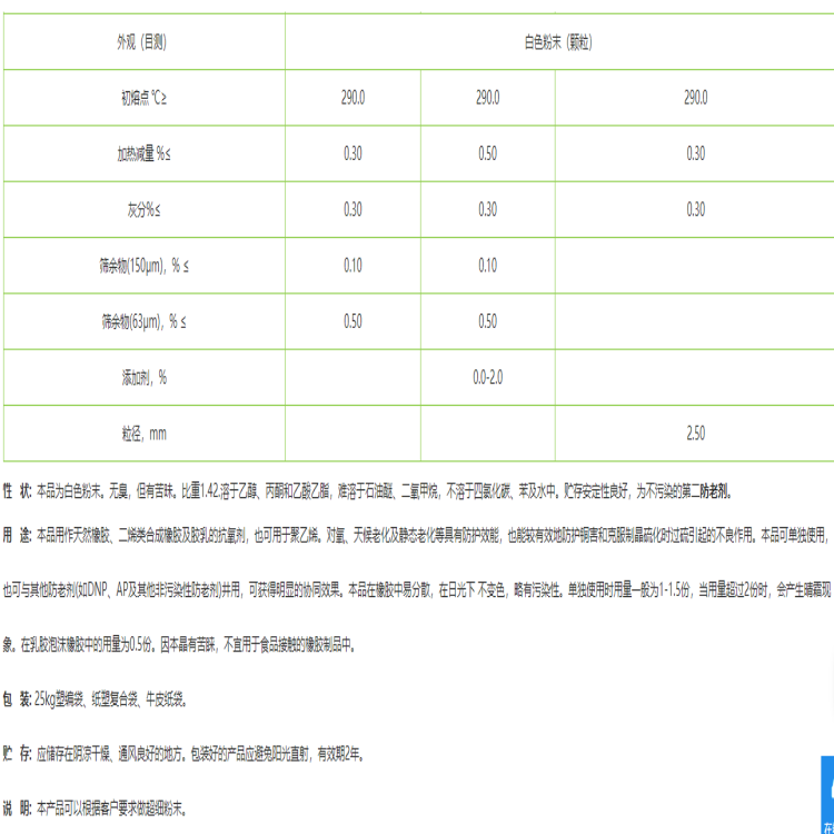 性 狀: 淡黃色粉 末(顆粒),微有苦味,無毒。比重為1.70,分解溫度300℃?扇苡诼 仿、丙酮 ,部分溶于苯 和乙醇、四氯 化碳,不溶于汽油、水和乙酸 乙酯。貯存穩定。遇強酸 或強堿 溶液即分解。
