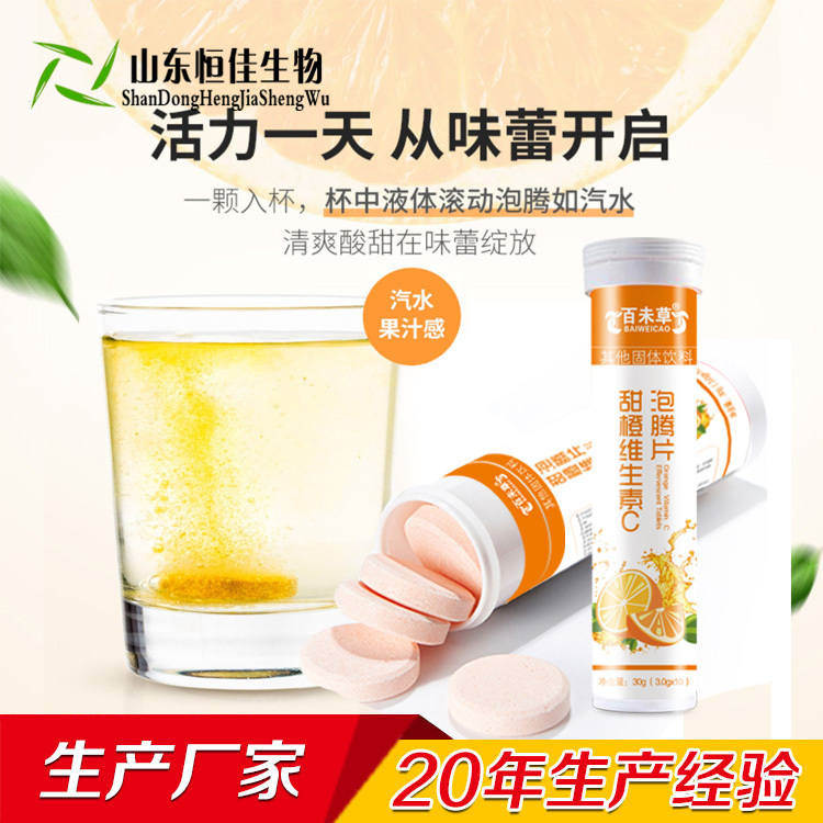 泡騰片與普通片劑 不同,泡騰片利用有機酸 和堿 式碳酸 (氫)鹽 反應(yīng)做泡騰崩解劑 ,置入水中,即刻發(fā)生泡騰反應(yīng)。其特點風(fēng)味自然,速溶性好,應(yīng)用范圍廣,飲用方便。維生素 c泡騰片代加工vc泡騰片oem貼牌代工山東恒佳。