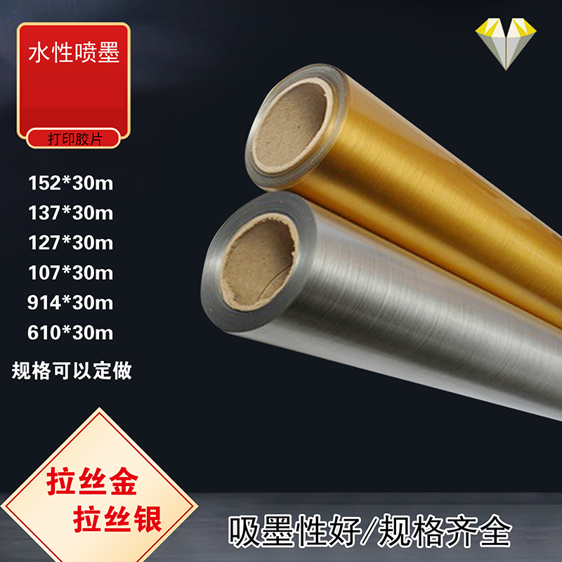 產品特性:進口耐高溫pet材質,先進的生產工藝,吸墨速度快圖案清晰,不卷邊、不翹邊、筆直堅挺、不易變形、耐熱可達150度,可輕松過覆膜機;金銀色、硯、光面、色彩還原度好、硯圖片、畫面逼真、人物畫面更顯魅力,底色較重,更加搶眼。做照片的最_佳_首_選_材料,采用國外先進涂層工藝,吸墨性好,冬天不結晶,拉絲紋薄膜表面看起來具有優良金屬質感,拉絲紋直觀明顯、有立體感、亮度高表面細致均勻、顯得精致、高貴;圖案清晰。使用弱溶劑 或溶劑 型墨水打印,完全防水防紫外線弱溶劑 涂層,適用戶外。