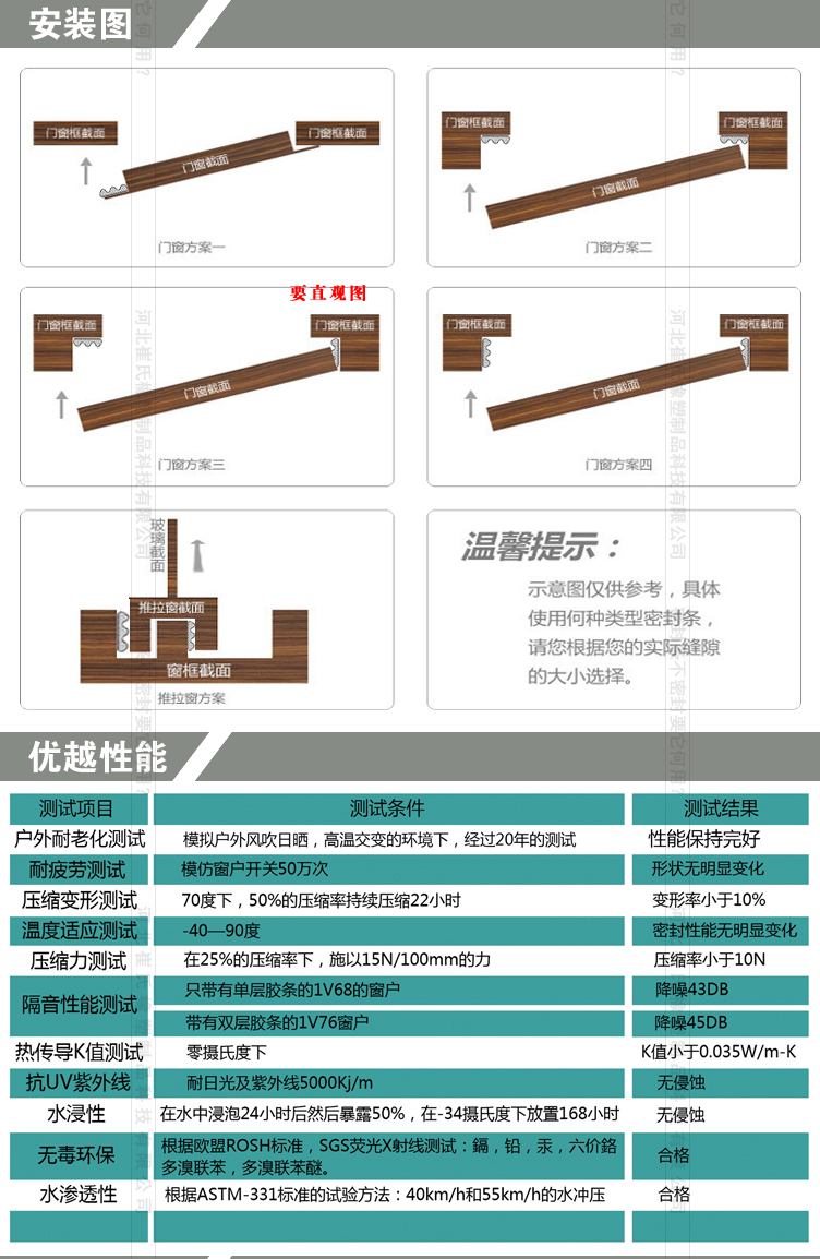 崔氏密封理念:綠色環(huán)保,時(shí)尚密封;完美解決密封與隔音的矛盾,實(shí)現(xiàn)密封隔音雙重效果;高檔門窗完美搭配產(chǎn)品;現(xiàn)代門窗的絕好伴侶;柔軟的質(zhì)地,良好的效果,持久的性能;同樣的產(chǎn)品 異樣的質(zhì)量,我們只做高性能產(chǎn)品!��縮力測(cè)試、熱傳導(dǎo)k值測(cè)試、水侵性、水滲透性等測(cè)試中均取得超越所有傳統(tǒng)產(chǎn)品的優(yōu)秀的結(jié)果;同時(shí)包覆式密封條節(jié)能環(huán)保、隔音降噪、抗強(qiáng)紫外線,無(wú)毒、不與任何油漆、清潔劑 發(fā)生反應(yīng),迎合新時(shí)代綠色健康主題。
