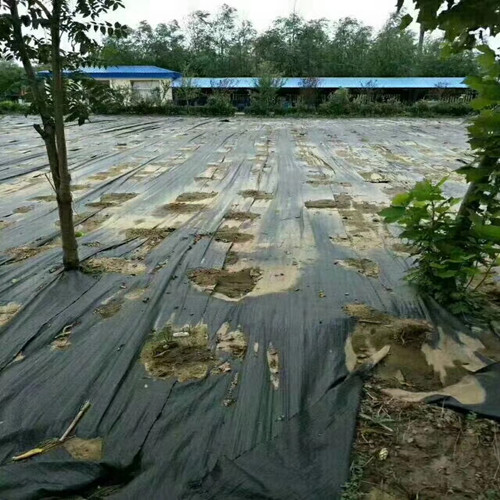 大部分地區為了防治雜草生長,阻止植物根系鉆出地面,一般采用吹塑的pe膜(黑色或者白色的塑料膜)作為防草布,由于pe膜是透明的,陽光能夠透過pe膜照射到pe膜下面的雜草,雜草能進行光合作用,起不到防雜草生長的作用,而且這種pe膜的密封性較好,透氣性較差,滲水能力不足,使得植物根部的吸水能力不足,影響植物的生長,透氣性較差地溫增高也可能導致植物的根部腐爛。pe膜壽命短,基本一年就壞了,勞動成本高。