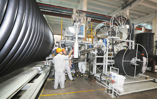c)、冷態脫模,管材冷卻至常溫時,采用模具收縮方式脫模,管材不會變形。而hdpe中空壁纏繞管,采用國產設備和技術,以高密度聚乙烯材料(hdpe)為原料,在熱熔狀態下纏繞成型,采用水冷,符合國際gb/t19472.2-2004規定的a型結構壁管。在工藝上先擠出方形管,經水冷卻后定形,再纏繞成圓形管,再用水冷卻。