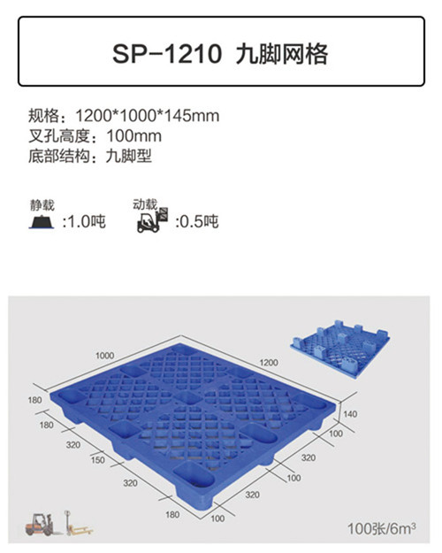 (1)承重均勻設(shè)計:九腳均勻分散在托盤受力點處,使托盤受力均勻,不易變形。