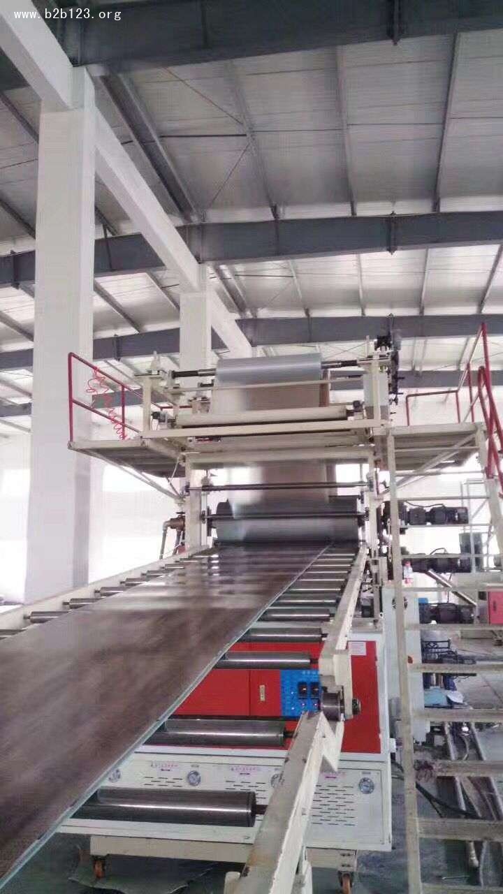 spc石塑地板生產線,pvc鎖扣地板設備,lvt鈣塑復合地板生產線,pvc石塑地板設備工藝流程:新型pvc石塑地板同步對花生產線由自動上料進入高速混料機、高速熱混、冷混,可再配五噸儲料罐及每個進料囗配上環保吸塵系統(使車間無灰塵)、再自動上料到雙螺桿擠出機、由大板模具結構出料進行四輥定型、壓光、壓花其間表面多層膜同時進入五輥熱粘合于一體),排輥托架冷裝置、裁邊裝置、牽引切割機、自動剪板機、自動堆板機等組成。機組結構緊湊,性能優越。螺桿、料筒經優化設計,并采用高性能雙合金鋼加工,使整機具有塑化均勻,擠出量穩定,產量高,壽命長等優點。主機料筒采用鑄鋁加熱器加溫,風冷卻,精密電腦屏控制溫度。精密的定型壓光裝置,通過其良好的調整功能使板材定型優良。切割部分采用定長切割裝置,保證板材長度準確。