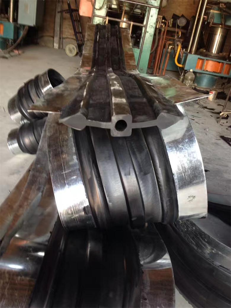 材料的選擇及要求鋼邊:選用鍍鋅鋼邊;橡膠:通常選用天然橡膠、氯 丁橡膠、三元乙丙橡膠等。要求橡膠和鋼邊能有效地粘結(jié),它們之間的粘結(jié)強(qiáng)度(剝離強(qiáng)度)應(yīng)達(dá)80~10n/2.5mm,以使它們?cè)谕饨鐥l件變化情況下不被拉脫。通常鋼邊邊緣沒有工藝孔,安 裝澆筑混凝土?xí)r,利用工藝將止水帶和鋼邊用細(xì)鐵絲纏繞固定,以保證澆搗密實(shí),使鍍鋅鋼片和混凝土有效地牢固粘附。