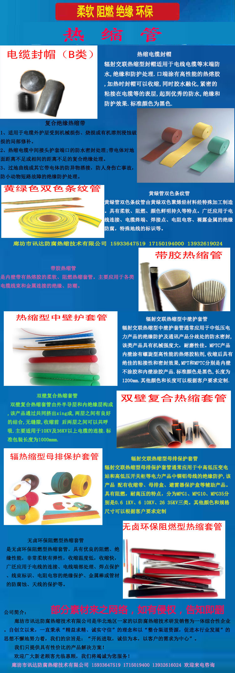 另供應黃綠管雙色條紋管、帶膠熱縮管、無鹵環保熱縮管、中壁護套管、雙壁護套管、母排保護管,價格公道,質量合用,歡迎選購。