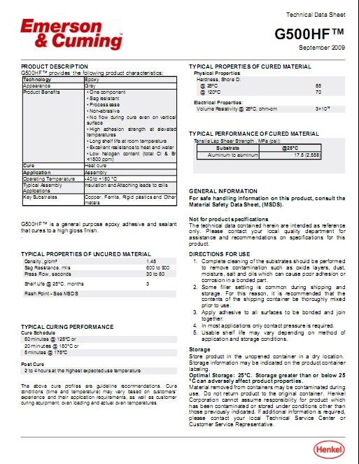 emersoncuming eccobond g500hf是一種不含鹵素 、單組份、熱固化的通用型環氧膠和密封膠。它是膏狀,抗坍塌性好,室溫保存期長。固化后表面光亮度好,具有優良的耐熱。防水和介電性能。