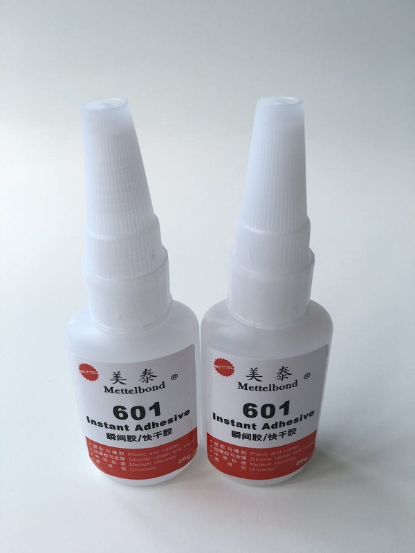 1、在待粘表面點上適量m-601膠水(根據粘接面積大小,可在膠嘴前端套上pe導管或者針頭以控制膠量)涂膠后將兩個面合在一起,3-5秒即可定位,3-5分鐘可達到不脫膠效果。【清除粘合件表面污垢、銹、油、脫模劑 、可用干凈的布加酒精。