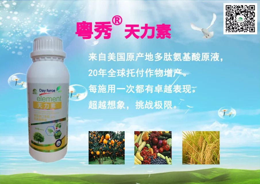 粵秀植保天力素 葉面肥富含氮、磷、鉀 等多種微量元素 能夠幫助果樹補充碳水化合物的積累和向果中的運輸量,確保果實膨大期營養元素 的需要,提高產量,改善品質。