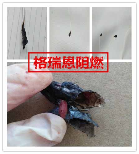 格瑞恩zbs-2133處理過的pa6觸火燃燒火勢小,煙少,離火5s左右自熄,無熔滴,成碳性好,結殼成碳,阻燃性能較高;一般市售阻燃劑 處理過的pa6樣品,觸火燃燒火勢大,濃黑煙,離火長時間不自熄,伴有熔滴,熔滴滴落后繼續燃燒1-3s,阻燃性能差。