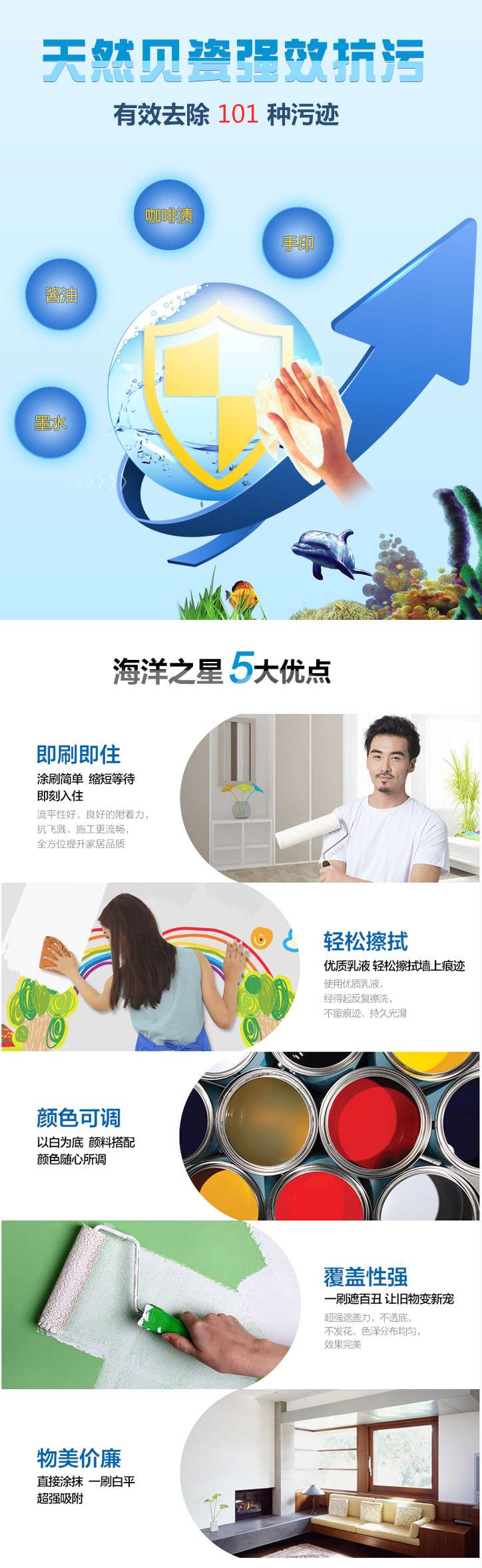 盛夏新品--嘉柏麗海洋之星貝瓷抗污漆,如今家居室內裝修漂亮時尚,但甲 醛 這個隱_形_殺手時刻肆虐橫行,肉眼看鼻子聞未必能夠完全清楚知道墻體甲 醛 存在多少,大多數消費者都有過這樣或那樣的安 全憂慮。而嘉柏麗海洋之星這款產品已通過國家建筑材料測試中心檢測,檢測結果顯示甲 醛 凈化率高達98%,持久甲 醛 凈化率高達95%。嘉柏麗內墻漆抗污新星——海洋之星貝瓷抗污漆,源自純天然貝殼砂,富含珍珠陳分,高效抵御常見污跡,漆膜如瓷器細滑如絲,輕松擦擦,墻面潔白無瑕!