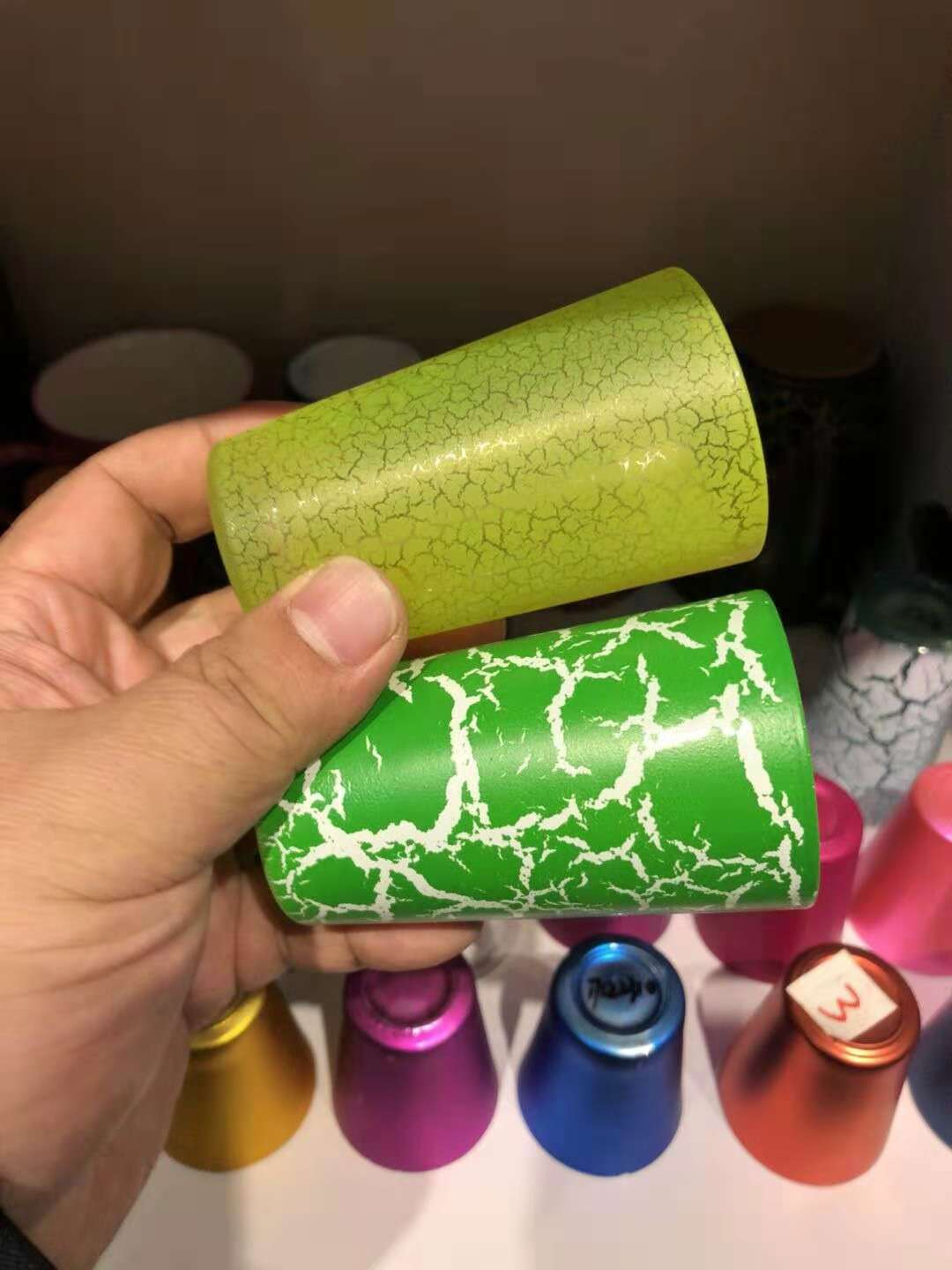 注 意:裂紋漆可以任意調(diào)配顏色。若要做出顏色反差較大的裂紋效果,先要做有色底漆,有色底漆要充分烤干,再噴光油層,噴完光油層只需稍微表干,不可太干,就可以噴裂紋漆,噴好放入窯爐烘烤。若需要裂紋大點,就可以噴厚一點,要細點就可以噴薄些。裂紋顏色要好看底漆、面漆的顏色反差大點,譬如,噴紅色裂紋漆,底漆可配白色和黑色。裂紋漆顏色可以調(diào)任意色。