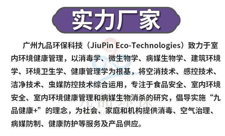 廣州九品環保科技(JiuPin Eco-Technologies)致力于室內環境健康管理,以消毒學、微生物學、病媒生物學、建筑環境學、環境衛生學、健康管理學為根基,將空消技術、感控技術、潔凈技術、蟲媒防控技術綜合運用,專注于食品安全、室內環境安全、室內環境健康管理和病媒生物消殺的研究,倡導實施“九品健康+”的理念,為社會、家庭和機構提供消毒、空氣治理、病媒防制、健康防護等服務及產品供應。...