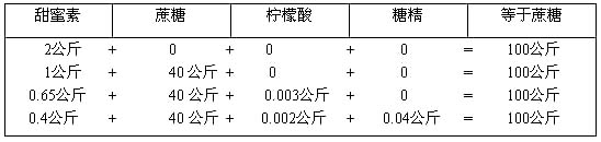 3、 甜蜜素與蔗糖及0.3%重量的有機酸(如檸檬酸)配合使用,甜度可達100倍以上。