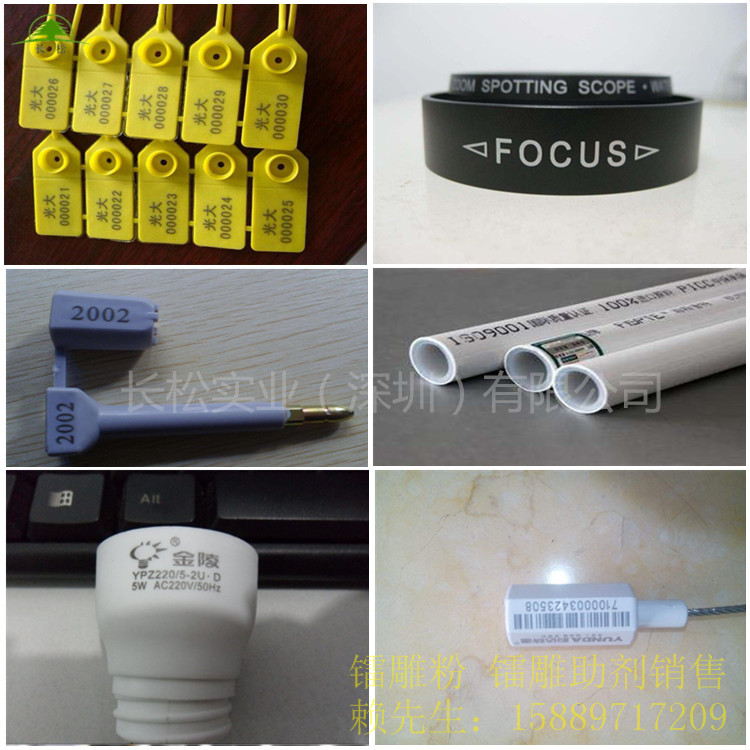 塑料產品激光打標雕刻不上清晰的字跡必須要在塑料原料里加入我們公司的鐳雕粉 ,激光粉 ,加了激光粉 的塑料產品,白色和彩色塑料就可以雕出黑色字,黑色產品上可以雕出白色和金色字,彩色產品上可以雕出白色字,字跡清晰,打標雕刻速度快!