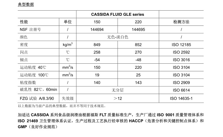 加適達食品 級潤滑油 gle 系列通過 iso 21469 認證,并在 nsf 注冊登記為 h1 類,用于存 在偶爾與食品接觸的部位。其原料均為 us 21 cfr 178.3570,178.3620 和 182 所認可的,可偶爾與 食品接觸的物質。