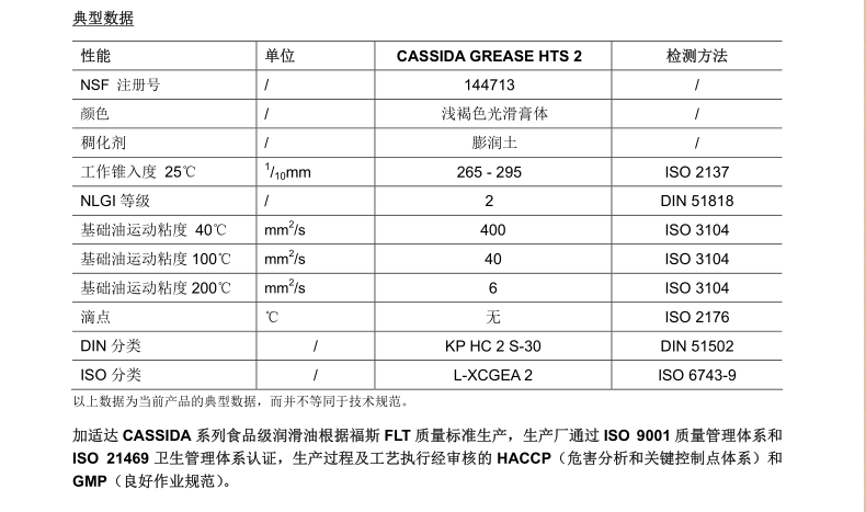 完全滿足食品行業的嚴苛要求。加適達食品級潤滑脂 hts 2 通過