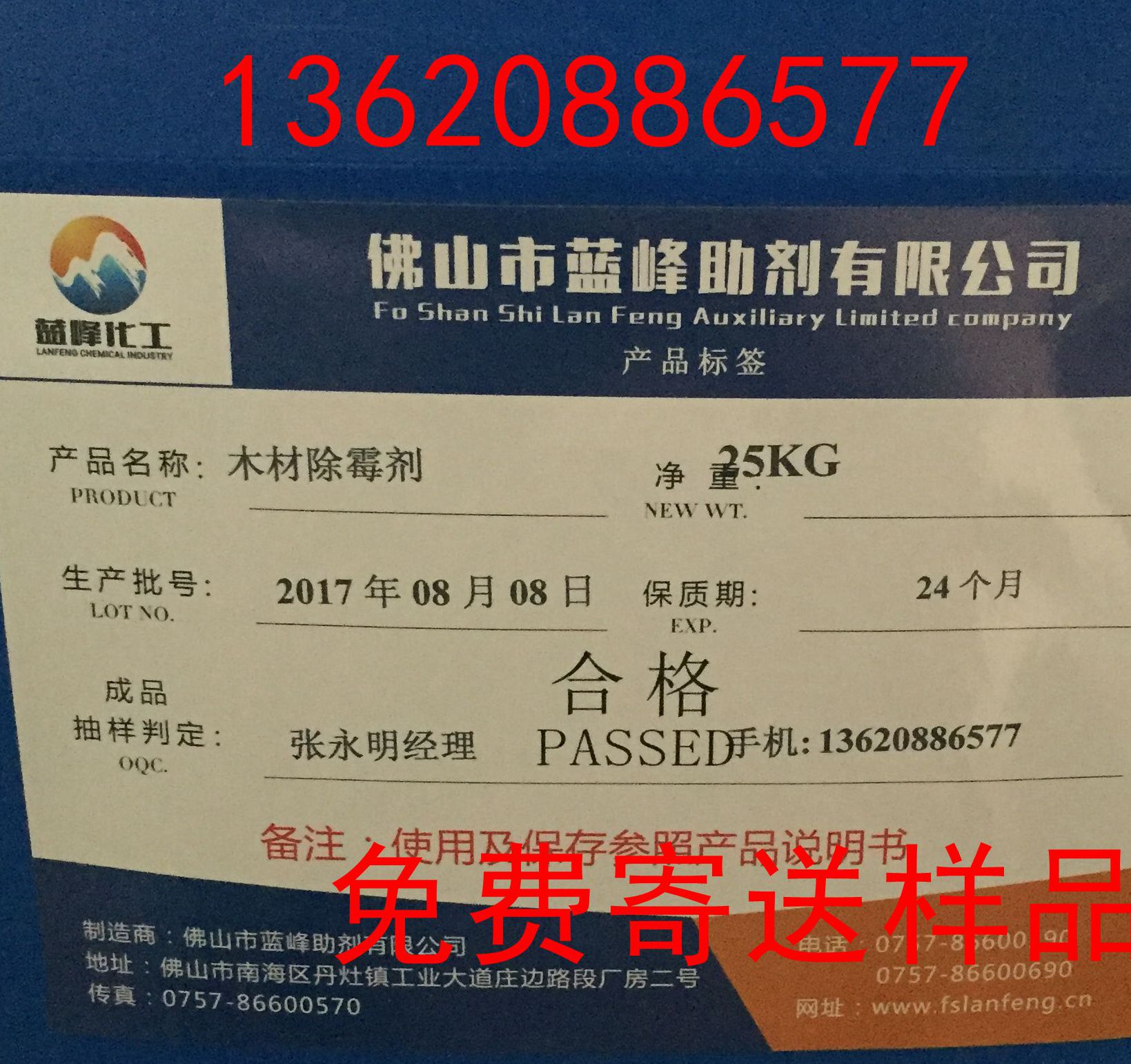 我佛 山市藍峰助劑 有限公司生產的木材除霉劑 產品是新一代高活性除霉、去霉濃縮液,產品主要成分為霉菌分解因子、殺菌抑菌劑 ,可去除多種細菌、真菌、蛀蟲、及霉菌孢子引起的產品霉變,是目前市場上最有效、最快捷、最實惠的新型除霉產品。執行標準 國家標準gb18582-2001