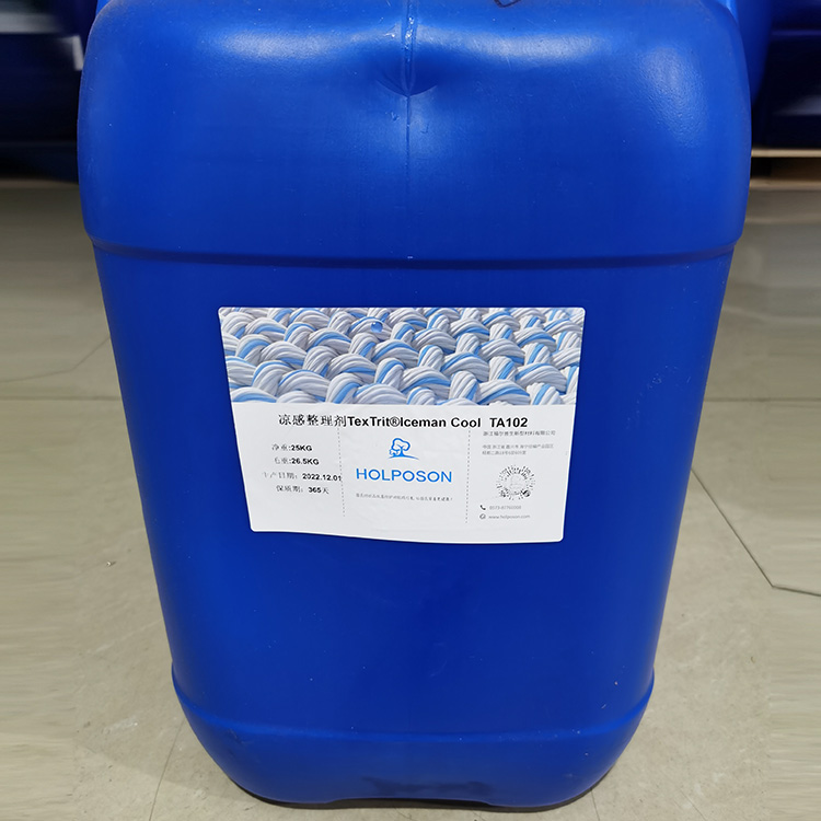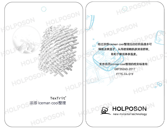 HOLPOSON®ICEMAN COOL也叫酷冰 俠®是一款專門針對紡織品開發的涼感功能整理劑 ,是由我公司的東華大學博士團隊開發的以木糖醇,赤糖醇,絲蛋白為主的接觸吸濕涼感整理劑 。適合用于天絲,冰 絲,棉,滌綸等各種纖維的后整理。其作用原理:涼感整理劑 HOLPOSON® ICEMAN COOL處理在面料表面的木糖醇遇水發生吸熱反應,釋放涼爽因子從而使接觸到涼爽因子的皮膚清涼舒爽,另外其所含有的絲蛋白成分具有良好的保濕功能,清涼保濕雙組合使得人們在炎炎的夏日有降溫防護的可能。