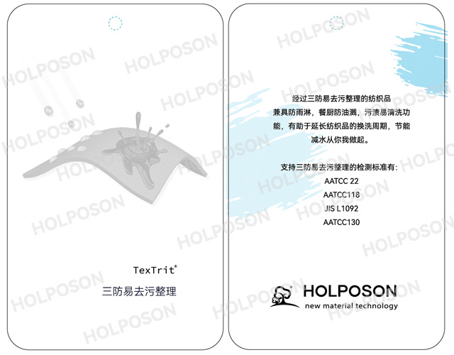 HOLPOSON® Smart Clean-T 親水易去污整理劑 HOLPOSON® Smart Clean-T 是經過特殊改性聚酯類親水易去污整理劑 ,能夠賦予加工織物良好的親水,抗靜電,吸濕速干,蓬潤性等性能,且耐洗性達50次以上(JIS L0217. 103法,連續洗滌法)經過易去污整理后的紡織品面料,在一定程度上可以清水擦除所沾污漬,如:醬油,番茄醬,玉米油,圓珠筆油污等。滿足家庭主婦對淺色衣物易打理易清潔的要求。使難去除、易殘留的臟污,可以去除干凈,達到污所不落,節能去污。HOLPOSON® Smart Clean-T 適用于天然纖維、合成纖維及其混紡織物,目前易去污整理可用于開發淺色系列的童裝面料,羽絨服面料,沙發面料,工裝,職業裝,襯衫,白T恤等等。