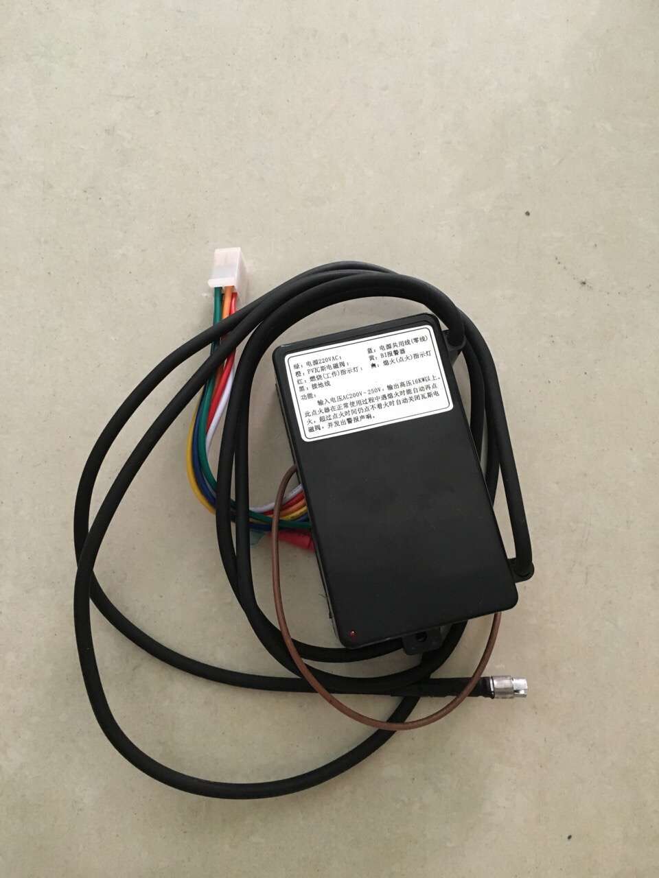 外型尺寸: l ( 128mm ) w ( 73mm ) h ( 42mm )安 裝孔距: 118mm 孔徑φ 5mm。點火器共有九根線,接線說明如下:1. n : 點火輸出,2. s : 信號感應,3. 綠: 電源 220v,4. 藍: 電源共用線,5. 橙藍: pv 瓦斯電磁閥,6. 白藍: l1 熄火(點火)指示燈,7. 紅藍: l2 燃燒(工作)指示燈,8. 黃藍: bz 警報器,9. 黑: 接地線。