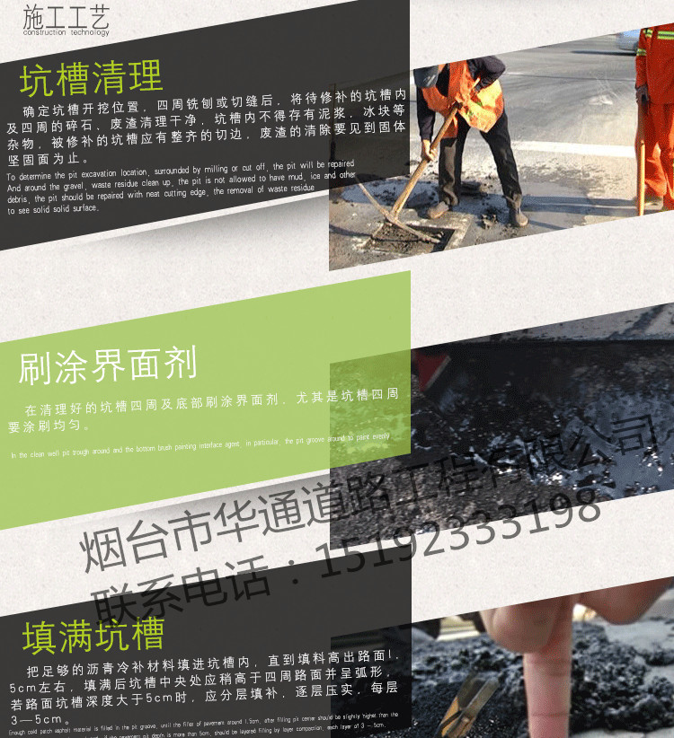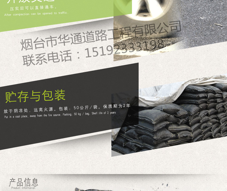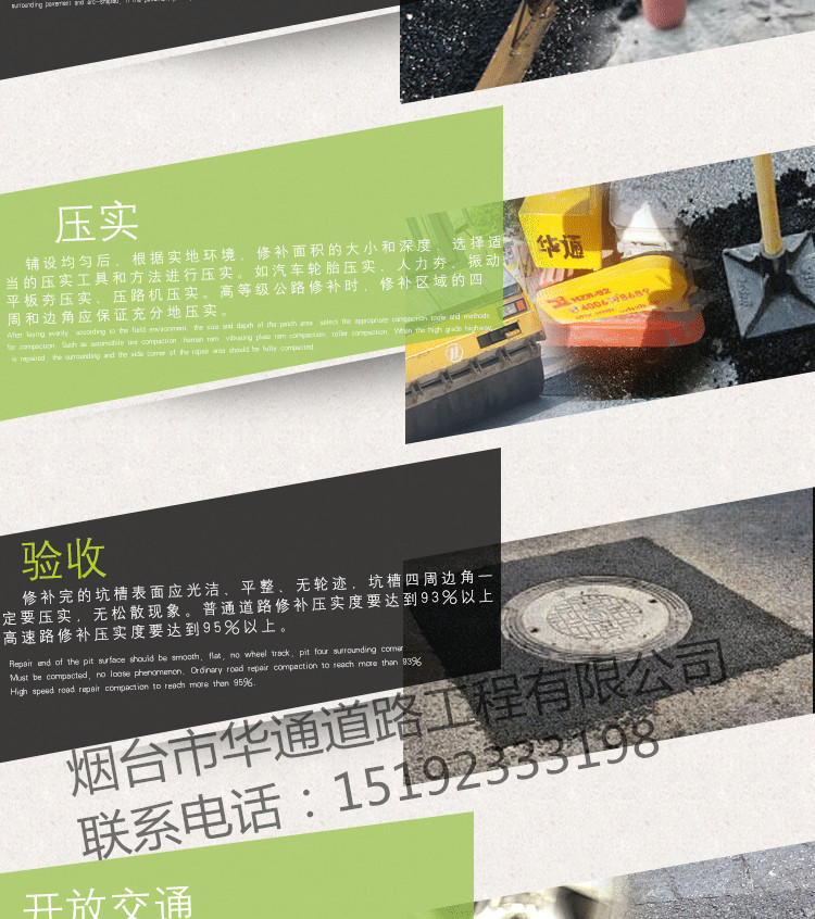 “華通瀝青冷補料”是一種高科技道路修補材料,核心材料源自美國進口,性質穩定,粘度大,可以在-。4. 壓實 鋪設均勻后,根據實地環境,修補面積的大小和深度,選擇適當的壓實工具和方法進行壓實。如汽車輪胎壓實、人力夯、振動平板夯壓實、壓路機壓實。高等級公路修補時,修補區域的四周和邊角應保證充分地壓實。5、開放交通 壓實后可以直接通車。
