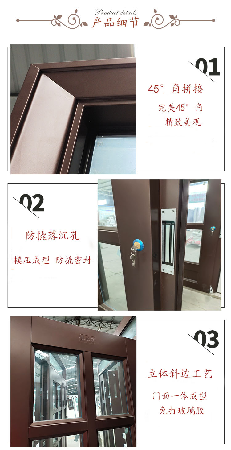 防盜、門框采用強大寬邊設計,雙層造型,不僅增添了門框強度,而且增添了美觀度。嵌入式隱_形_防撬邊,雙重防撬功能,配有加厚型的主鎖、天鎖、地鎖齊全,上下都有鎖點,防盜安 全性能好,防鉆、防撬、防割、防撞、防技術功能已達到了高標準, 讓客戶無后顧之憂。