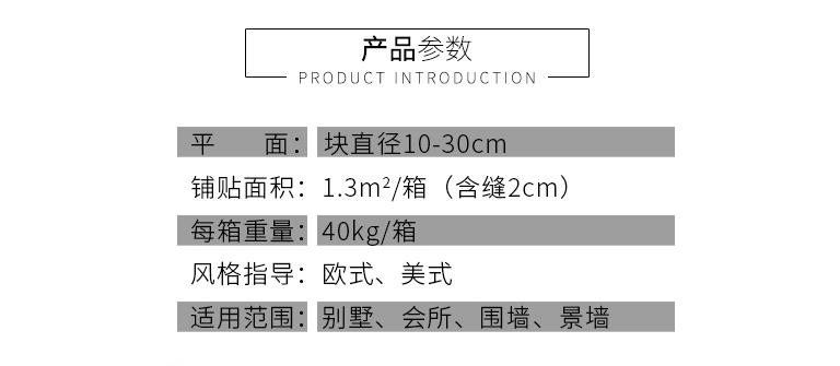 產品價格不一,有需要可來電咨詢:15167569341(微信同號)產品描述:不規則狀,大小不一的石塊組合,同色系的顏色漸變,可搭配多種建筑自建房外墻,體現古樸、自然的鄉村氣息。