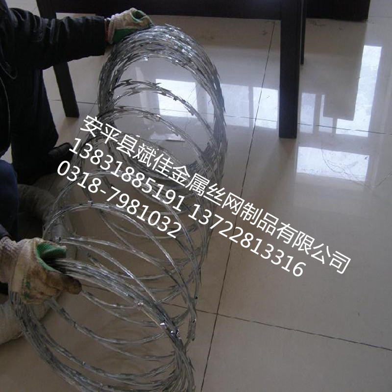 蛇腹形刀刺網(wǎng)也稱為刀片刺網(wǎng)、刀片刺繩、刀刺網(wǎng),是一種安 全系數(shù)極高的新型防護網(wǎng)。