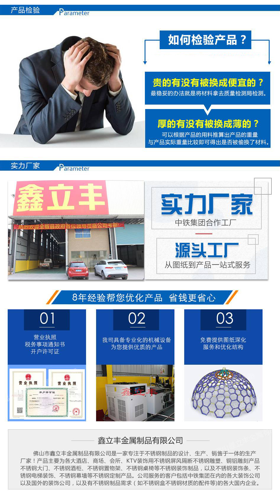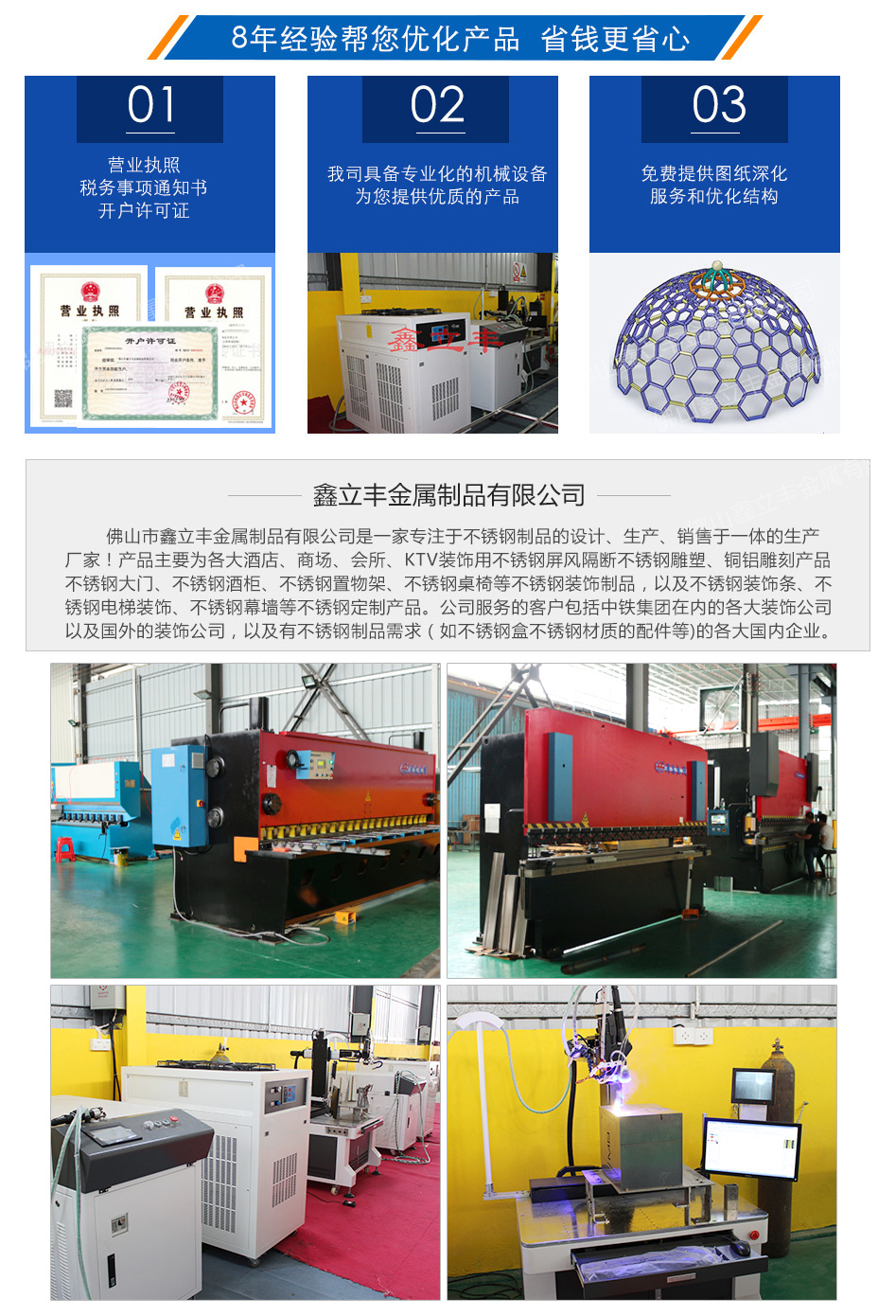 佛 山市鑫立豐金屬制品有限公司承接:不銹鋼屏風;不銹鋼酒柜/酒架;不銹鋼門套/門框;不銹鋼拉手/扶手/立柱;不銹鋼門;不銹鋼踢腳線;不銹鋼裝飾板等不銹鋼裝飾工程(不銹鋼工程裝飾材料供應)。公司生產不銹鋼工程裝飾制品、不銹鋼工程裝飾屏風、不銹鋼花紋摟空裝飾品、不銹鋼高檔酒架、不銹鋼工程裝飾異形件、不銹鋼奢華拉手、不銹鋼電鍍展示架、不銹鋼電鍍工程門套、大門、不銹鋼金屬標識標牌、金屬logo、不銹鋼吊頂天花、不銹鋼拱門、不銹鋼雕花、不銹鋼外墻、不銹鋼屏風隔斷、不銹鋼大堂、不銹鋼鏡框、不銹鋼走廊、。應用在建筑行業,例如建筑物外壁、窗框裝飾、電梯廂板、車廂板、廳堂墻板、天花板、戶外工程、廣告 銘牌、走道板、屏風、地道工程、酒店、大堂內外墻等大型建筑裝飾酒店、大廈商務裝飾、公共設備、新房裝飾、星級酒店,大型商場,絢彩酒吧,奢華ktv,服裝展現柜的奢華裝修。不銹鋼門套是一種不銹鋼復合裝飾型材,它是由不銹鋼面板和高強內襯復合壓制成各種樣式和規格,產品特色及優缺點:不銹鋼豪華門套以304不銹鋼為主要基材,采用先進的表面花紋制作工藝,高檔防水環保漆處理,天然環保、防水防開裂、結實耐用不銹鋼門套;門框+酒店ktv黑鏡鋼、鈦金不銹鋼門框門套