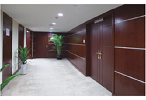 南京木門-南京特億福護墻板是用各種名貴木材如紅櫸、櫻桃木等0.6mm厚進口實木單板做為木飾面,經過復雜的設備流程、160t壓力、250度高溫將單板牢固定在模板基層上,將原本在現場裝修項目木工工程和木器漆工程中凡是要做油漆的飾面部分在工廠內通過精加工作業進行生產,然后到現場進行組裝。南京特億福護墻板的應用南京特億福高檔成品護墻板大量應用于星級酒店、高級寫字樓、會所、會議中心等高級商業建筑。
