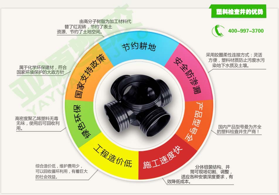 (2)安全環保,密封好防滲漏。塑料檢查井的材料是高密度聚乙烯、高密度聚炳烯塑料無毒無味,使用后可回收利用;密封性好能能杜絕雨污水滲漏、泄漏,以防止地下水污染。屬于化學環保建材,符合國家環境保護的大政方針。