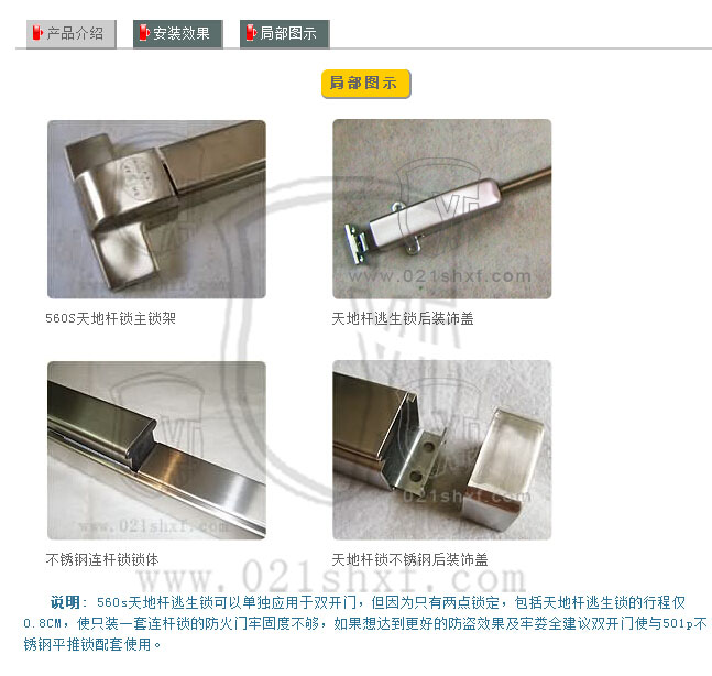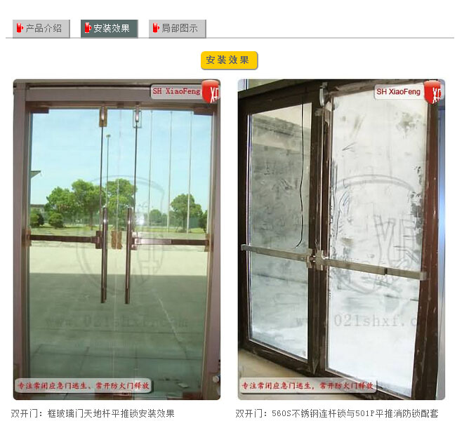 六、相關產品: 不銹鋼單雙門鎖 無報警烤漆單雙門鎖 天地桿下壓式消防鎖