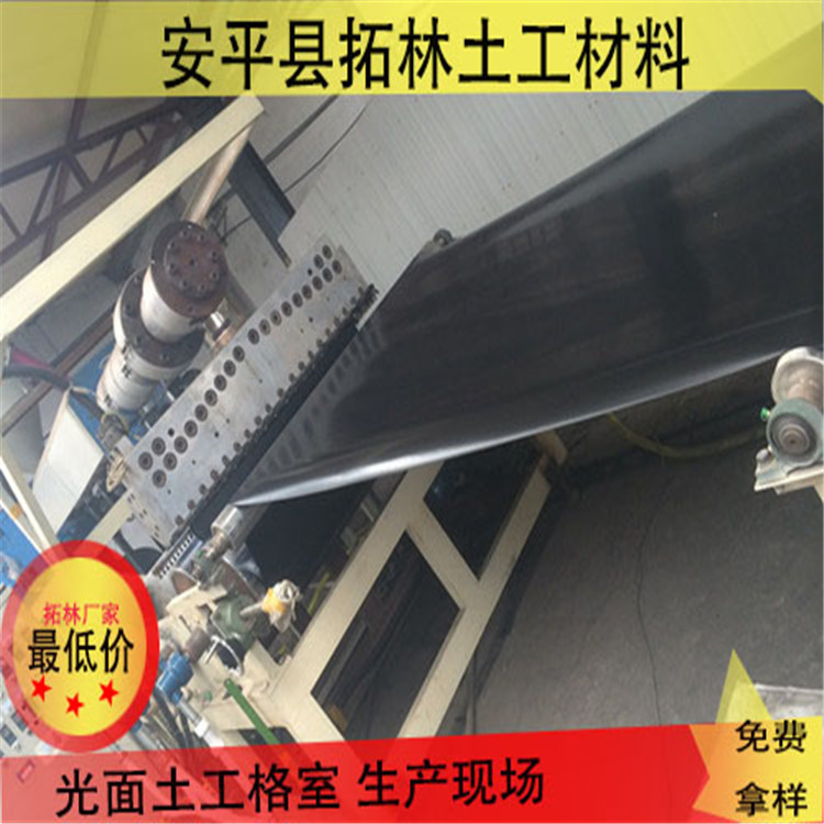 土工格室是由高強度的hdpe片材料,經過強力焊接而形成的一片網狀格室結構。一般經超聲波針式焊接而成。因工程需要,有的在膜片上進行打孔 。它伸縮自如,運輸時可縮疊起來,使用時可張開并又填充土石或混凝土料,構成具有強大側向限制力和大鋼度的結構體。它可用來做墊層,處理軟弱地基增大地基的承載能力,也可鋪設在坡面上構成坡面防護結構,還可用來建造支擋結構等。