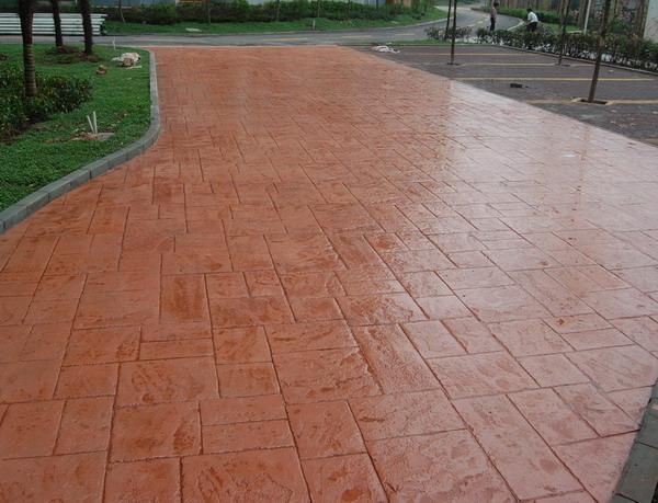 * 完結顏色交互:待關閉勤路水泥壓花一至兩天徹底硬化后,再運用洗衣粉 或洗潔精將其外表的脫模劑 沖刷,沖刷結束的拜石水泥壓花乃留有15%分配的脫模粉 ,這些脫模粉 大都散布在水泥壓花墮入的部位,能增加水泥壓花的立體感、層次感和顏色突變。待水泥壓花外表徹底干透后,即運用勤路水泥壓花專用保護劑 關閉水泥壓花外表,使水泥壓花呈現天然石材的色澤和質感,一起增強勤路水泥壓花抗紫外線和防污染功用。