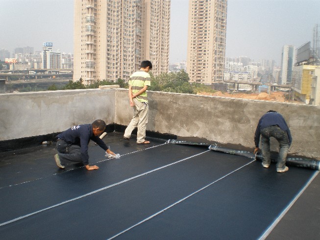 2、冷粘法施工鋪貼卷材:將卷材罷好位置,留出搭接邊縱向10cm,橫向 20cm的接縫,要求鋪貼密實(shí)平整,結(jié)合粘合劑 ,干燥20min后用力滾壓 ,使其粘結(jié)密實(shí)牢固;收頭處理:收頭處卷材端頭應(yīng)裁齊后壓入凹槽內(nèi),并用金屬壓條釘壓固定,凹出用密封膏封嚴(yán)。