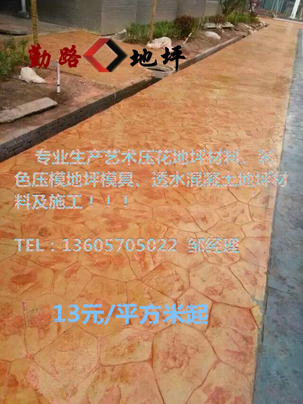 彩色藝術壓印地坪材料構成:彩色硬化劑 、彩色脫模粉 、專用封閉劑 系列材料。(詳情咨詢 tel:13605705022 鄒經理)