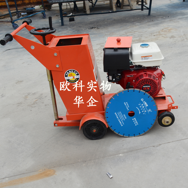 該機型結構簡單、重量輕、切縫平直、工作效率高,使用方便,是上述各行業進行建筑裝修、路面維護的必備機具。本切割機采用手推行走式切割送進。機頭主軸上安 裝有金剛石鋸片,鋸頭由電動機通過三角皮帶帶動。扶把前安 裝有可調節切割深度的手輪,轉動手輪使前行走輪升降,從而調節鋸片高度。機身上部有盛水水箱,鋸片切割前,應擰開水管開關,使管頭向鋸片兩邊噴水以進行冷卻并清除切縫泥垢。