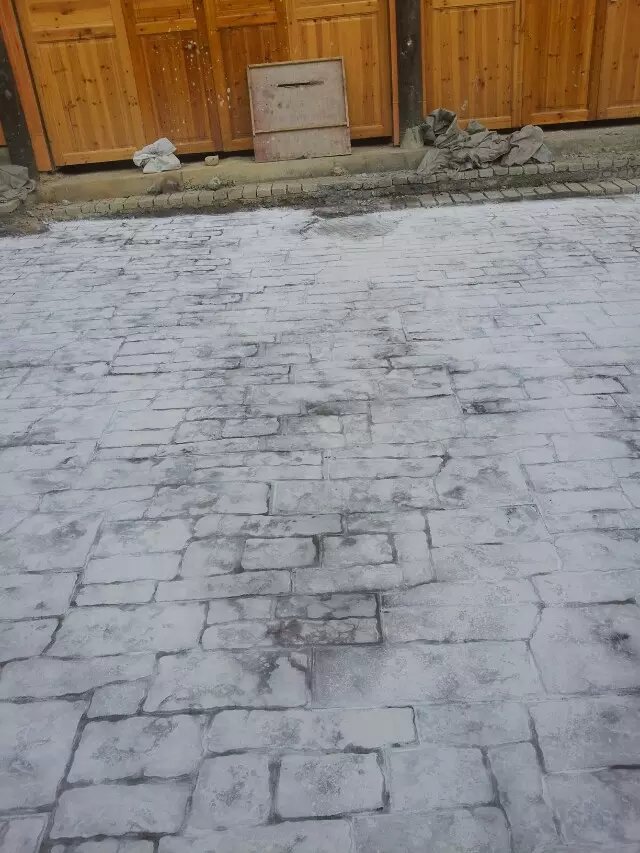 提漿收光 → 播撒壓花地坪強化料 → 精收光 →補強化料 →二次收光→撒壓花地坪脫模粉 →用壓花地坪模具壓印地面→封閉道路→沖洗壓模地面→涂刷保護劑 →完工。