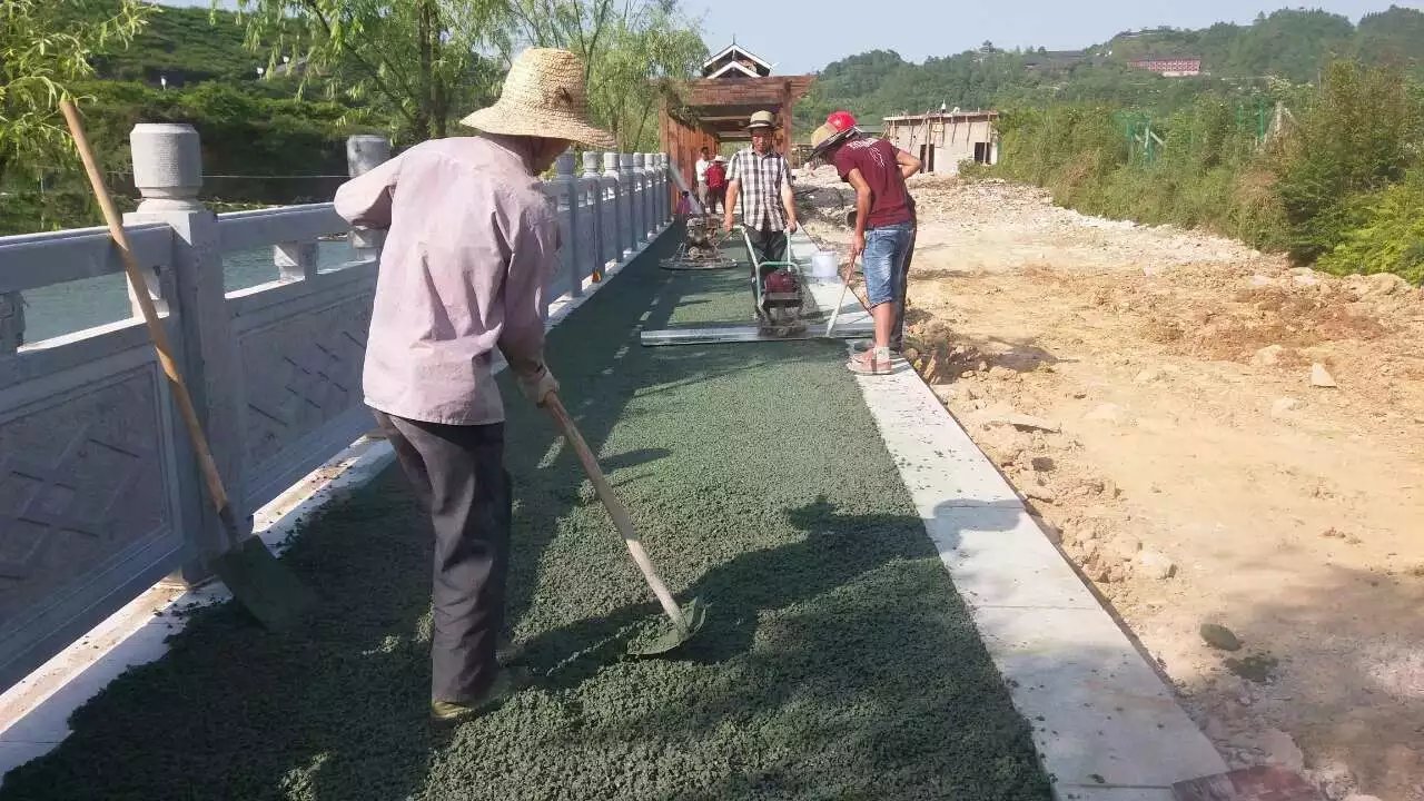 d. 表面修整:對碾壓后的路面應及時修飾透水混凝土的邊角,對于缺料的部位應填料修整,對于較干部位可先均勻噴灑一層水,再加料修整。