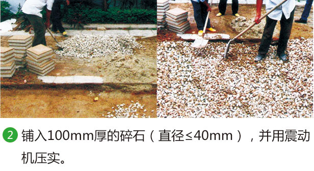2、鋪入120-150mm透水混泥土,碎石(直徑10-20mm)并用振動機壓實