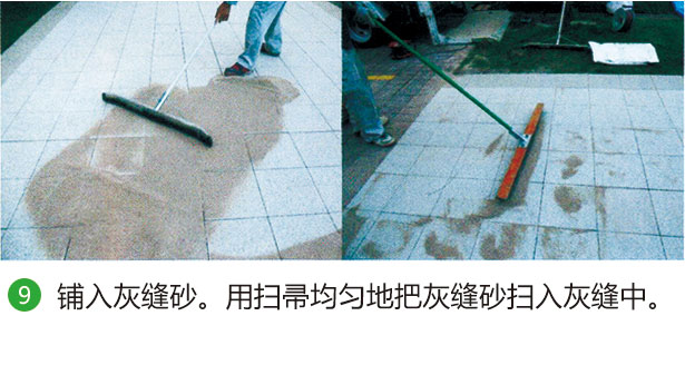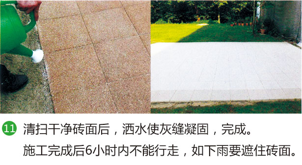 11、清掃干凈磚面后,灑水,使灰縫凝固,完成。施工完后6個小時內不能行走,如下雨要遮住磚面